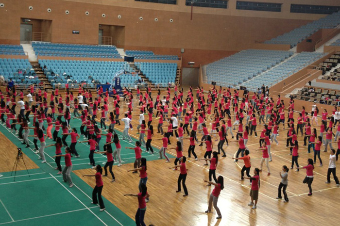 在体育部李晋老师、姚秀华老师的组织下,近400名教职员工和学生参与了此次活动。大家在激情的音乐和美妙的舞蹈中享受了健身的快乐,把我校的全民健身活动推向了高潮。