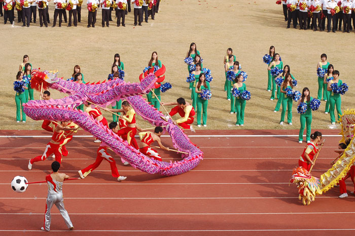 开幕式上,学生们进行了大型团体操、健美操、舞龙、功夫扇、舞剑、瑜珈等精彩表演。