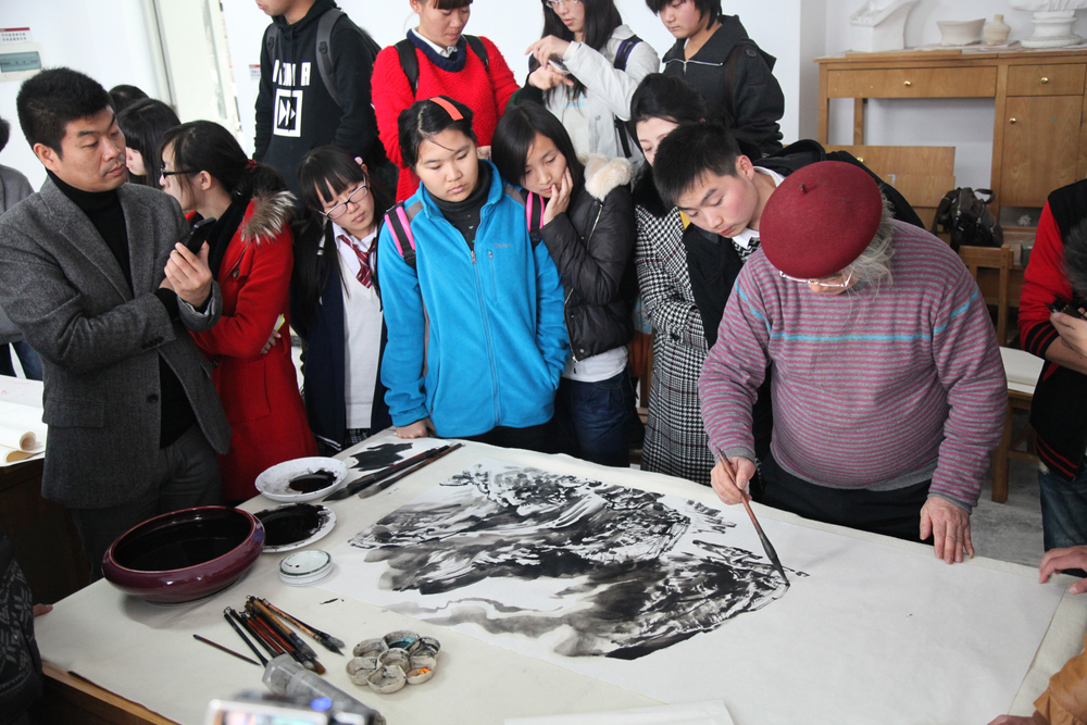 12月14日,上海海事大学徐悲鸿艺术学院邀请客座教授著名书画家谢仁杰、章柏年在文理学院1C117为艺术专业学生现场书画,原上海海事大学副校长蔡存强教授应邀到现场观摩。