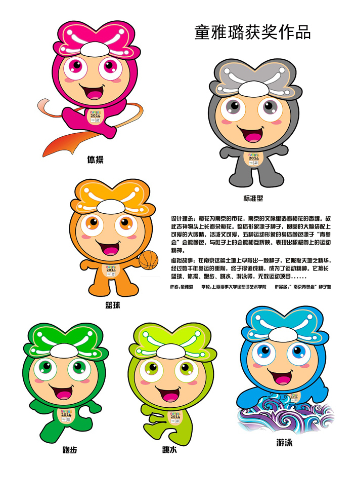 艺术设计10级童雅璐同学凭借其独特的创意和精细的制作从众多参赛者中脱颖而出,其吉祥物类作品《“南京青奥会”种子娃》获得全国赛区三等奖。其余艺术设计和工业设计的16名同学获得上海赛区优秀作品奖。吴桂香教授、蒋旻昱、吴剑英、吕宗奇等四位老师获得“优秀指导教师奖”。