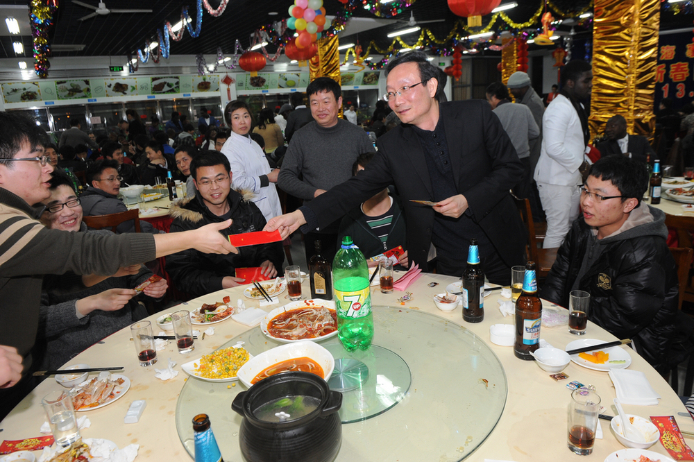 学校领导为寒假留校学生发压岁红包将团拜会又一次推向高潮。团拜会持续了近3个小时,现场喜庆、欢快,气氛热烈、祥和。