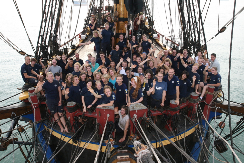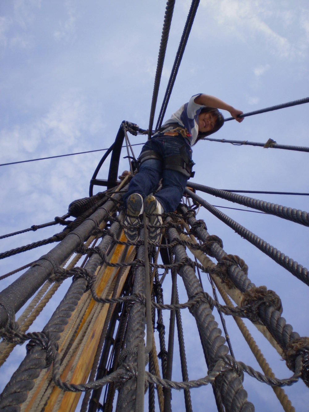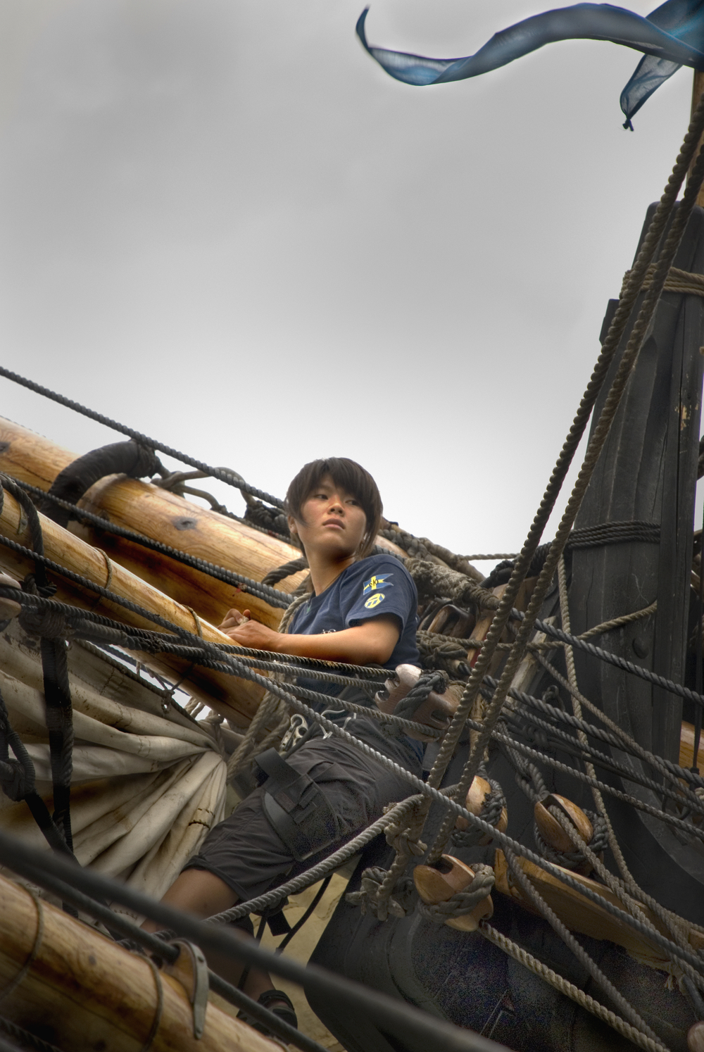 在“哥德堡”号上,除随行的香港记者外,我是唯一一名来自中国的志愿者,我意识到什么叫做“一个人的言行代表着一个国家的形象”。为此,我从不敢懈怠,努力适应“哥德堡”号高强度的工作负荷和科学严格的管理标准,并时刻注意自己的言行举止,做到有礼有节。作为志愿者,我们没有报酬,需要用自己的劳动换取食物和回程的机票。在他们之中,我属于少数经过专业航海知识培训的人员,在水手工艺、操舵、协助瞭望等方面很快就凸显出优势;而且相比其他志愿者,我的体重轻、运动协调性好,时常被分派进行高空作业工作,进出港之前在大桅最高处(高出海平面近60 米)进行升旗仪式几乎成了我的专属任务,“哥德堡”号的每一个角落都留下了我的身影。
