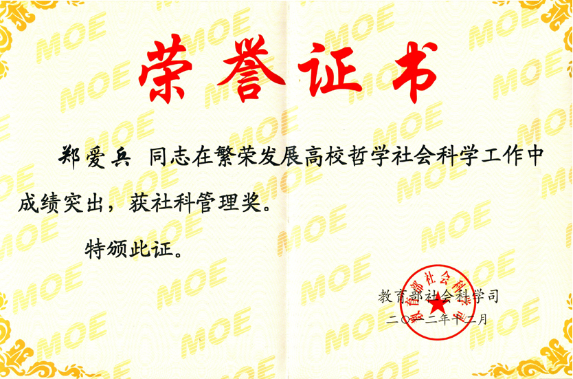 日前,教育部对在繁荣发展高校哲学社会科学中作出突出成绩的122个先进集体和294个先进个人进行了表彰。上海海事大学科技处郑爱兵被评为高校哲学社会科学研究管理先进个人,获社科管理奖,上海市共有6人获此殊荣。