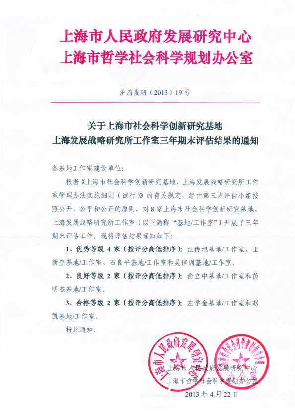 近日,上海市人民政府发展研究中心、上海市哲学社会科学规划办公室对8家上海市社会科学创新研究基地、上海发展战略研究所工作室进行了三年期末评估。上海海事大学汪传旭基地/工作室在评估中名列第一名,获得优秀等级(共4家)。