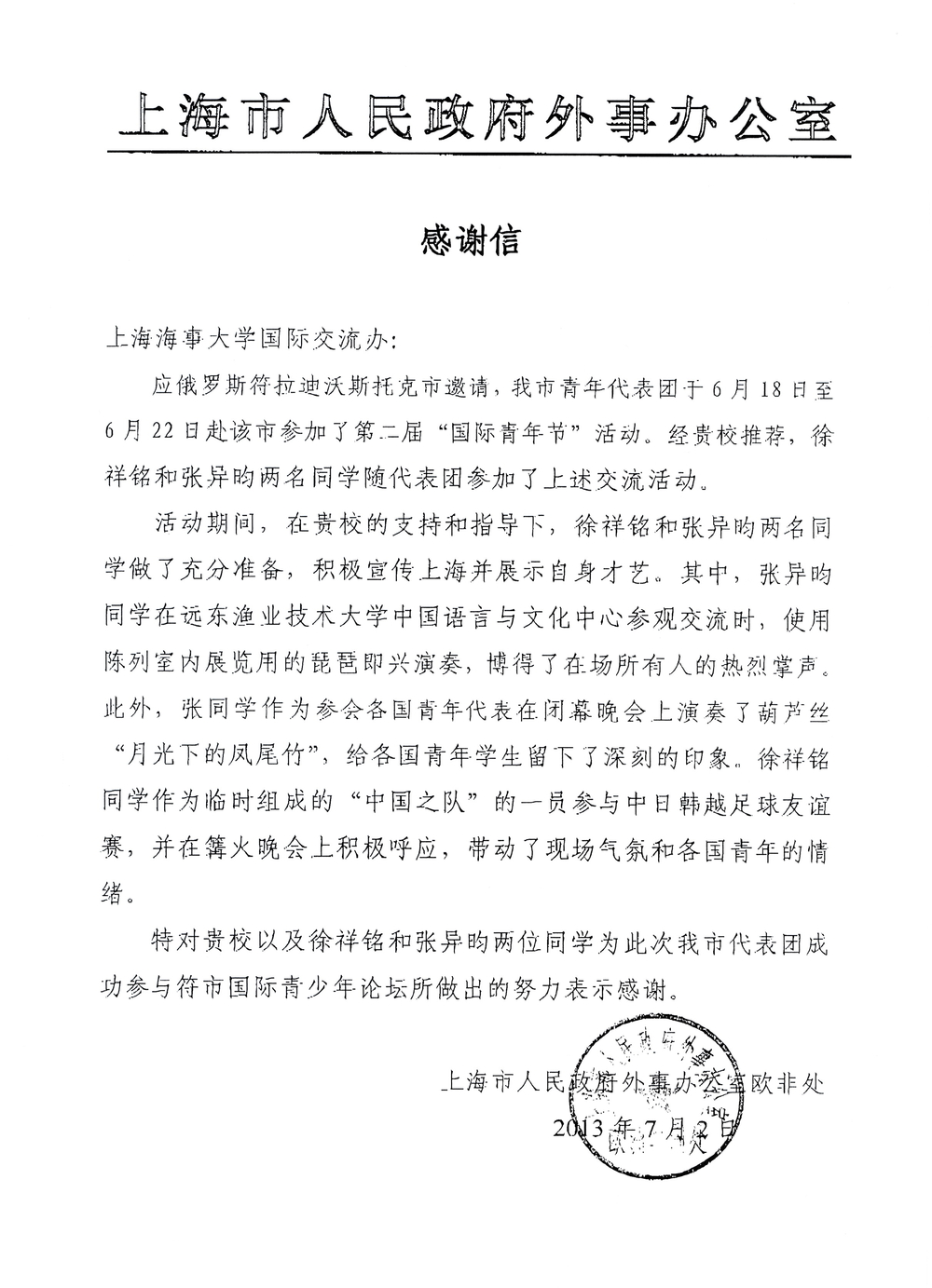 在上海与俄罗斯符拉迪沃斯托克市建立友好交流关系20周年之际,上海海事大学交通运输学院徐翔铭、外国语学院张异昀2位同学经学校选派,随上海代表团参加了于6月下旬在符拉迪沃斯托克举办的第二届“国际青年节(论坛)”。