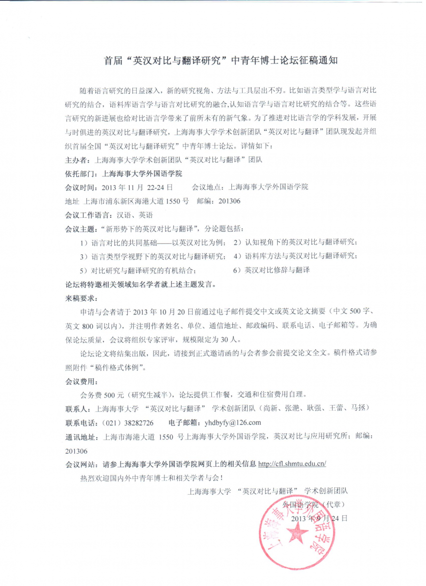 首届“英汉对比与翻译研究”中青年博士论坛征稿通知