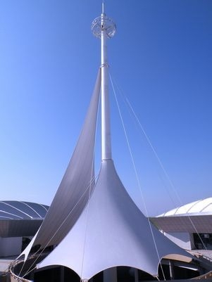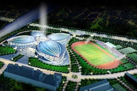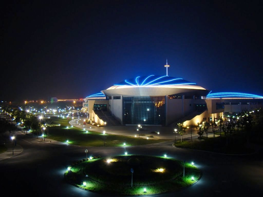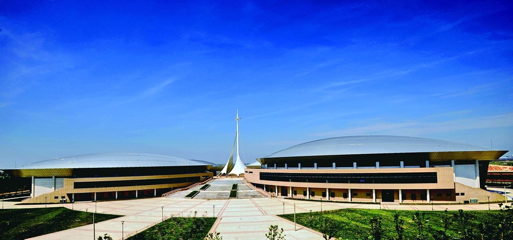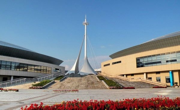 该馆由比赛馆、训练馆、游泳比赛馆、游泳训练馆组成。主体平面呈橄榄状四叶叶子,组合在一起犹如一个螺旋桨,中间高耸50米的桅杆好似螺旋桨的主轴,造型独特。占地面积约为101110平方米,总建筑面积为26643平方米,其中体育比赛馆11067平方米,体育训练馆2484平方米,游泳比赛馆及游泳训练馆10557平方米,本工程地上2层(局部3层),为钢筋混凝土框架结构,屋面为网架结构,上盖直立锁边条形双曲面彩钢板。其中游泳馆和游泳训练馆有1层地下室。