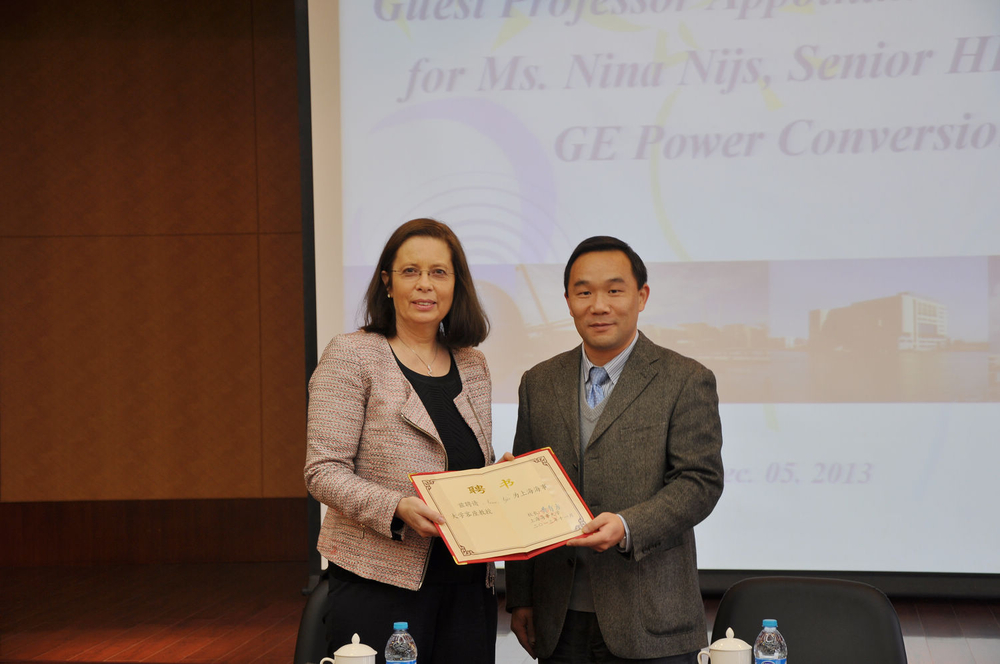 12月5日,通用电气能源集团全球人力资源总监Nina Nijs女士上海海事大学客座教授授聘仪式举行。王海威副校长出席仪式并为Nina Nijs女士颁发客座教授证书。国际交流处、经济管理学院负责人及师生代表等出席授聘仪式。