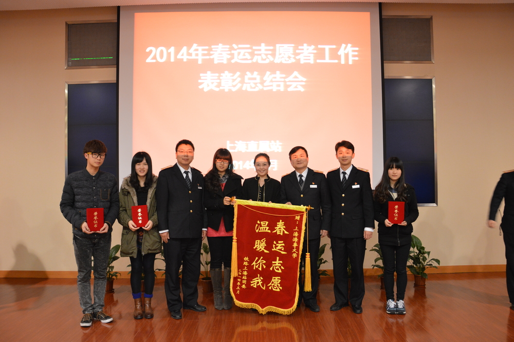 3月13日,“2014年春运志愿者表彰大会”在上海火车站会议室召开。上海铁路局党委书记、团委书记等与10所高校的春运志愿者代表出席。上海海事大学春运志愿者受到表彰,被授予锦旗。