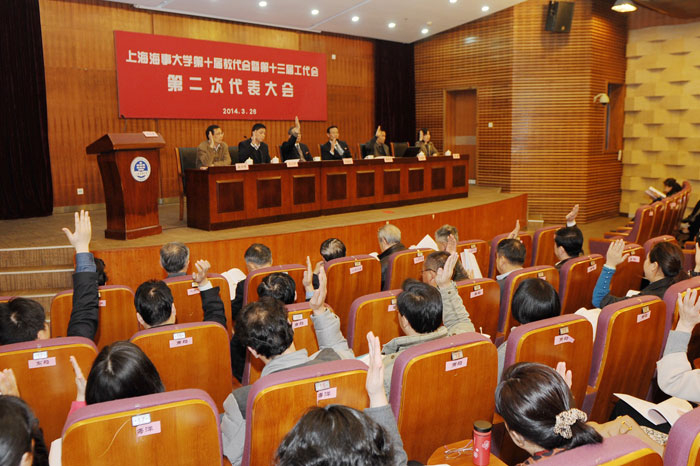校党委书记於世成致开幕词,代表学校党委对大会的胜利召开表示祝贺。他指出,2013年学校各项教育事业继续取得新的进展。在上海市、交通运输部及上级各有关部门的关心支持下,学校党政领导班子以开拓创新的精神和实事求是的态度,以科学发展观为统领,在广大教职工的共同努力下,学校在教学科研、学科建设、人才培养、合作交流、行政管理、后勤保障、精神文明创建等方面取得了新的成绩,朝着“有特色、高水平、多科性、国际化、教学研究型海事大学”的建设目标又迈进了坚实的一步。他表示,2014年学校将全面贯彻落实党的十八大和十八届三中全会精神,认真学习习近平总书记系列重要讲话精神,紧紧围绕学校内涵建设这一主题,促进人才培养、科学研究与经济社会发展、国家战略需要紧密结合,进一步提高教育质量、办学水平和创新能力。