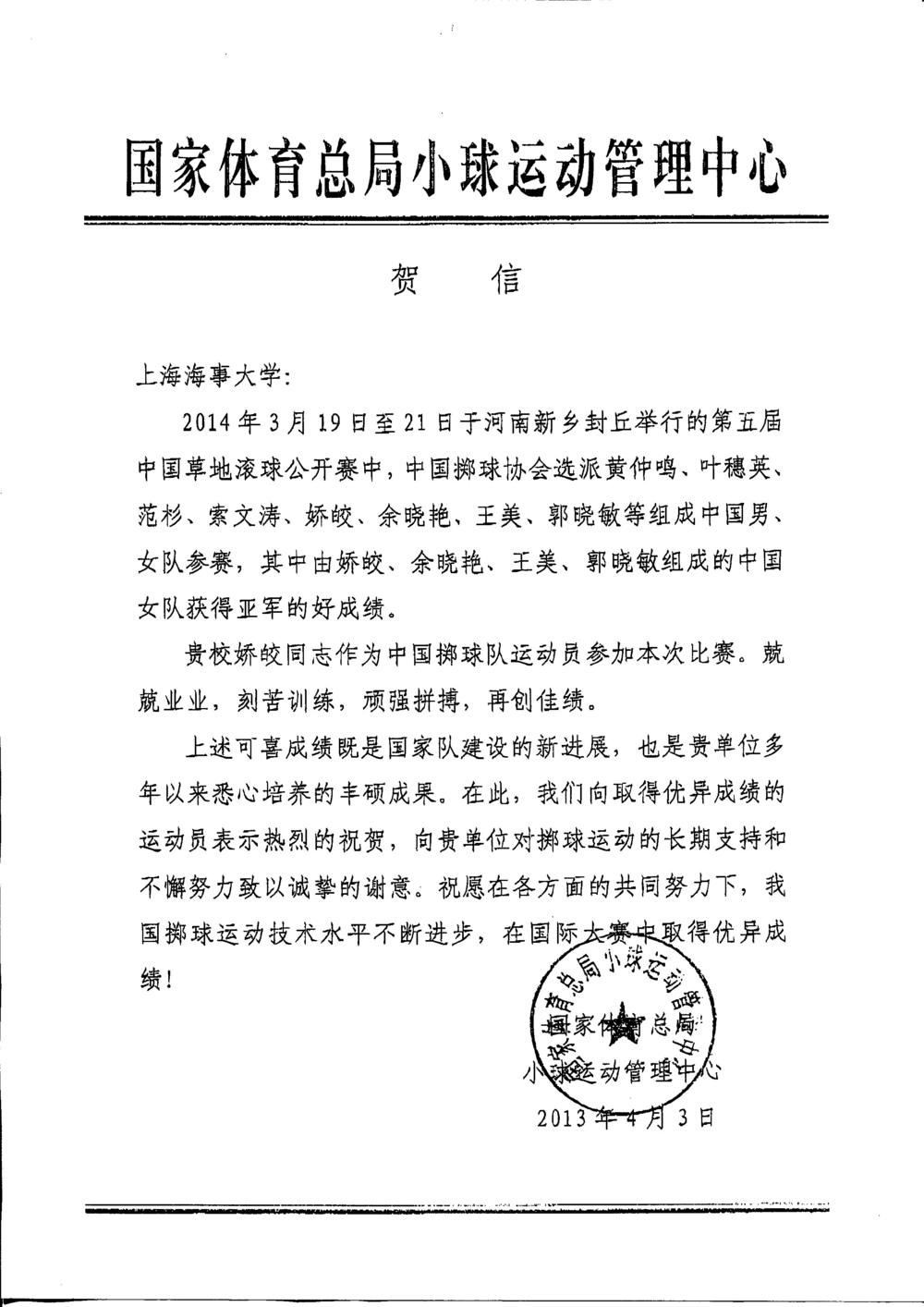 日前,国家体育总局小球运动管理中心致信上海海事大学,祝贺我校文理学院娇皎老师在第五届中国草地滚球公开赛中与队友合作获得亚军。