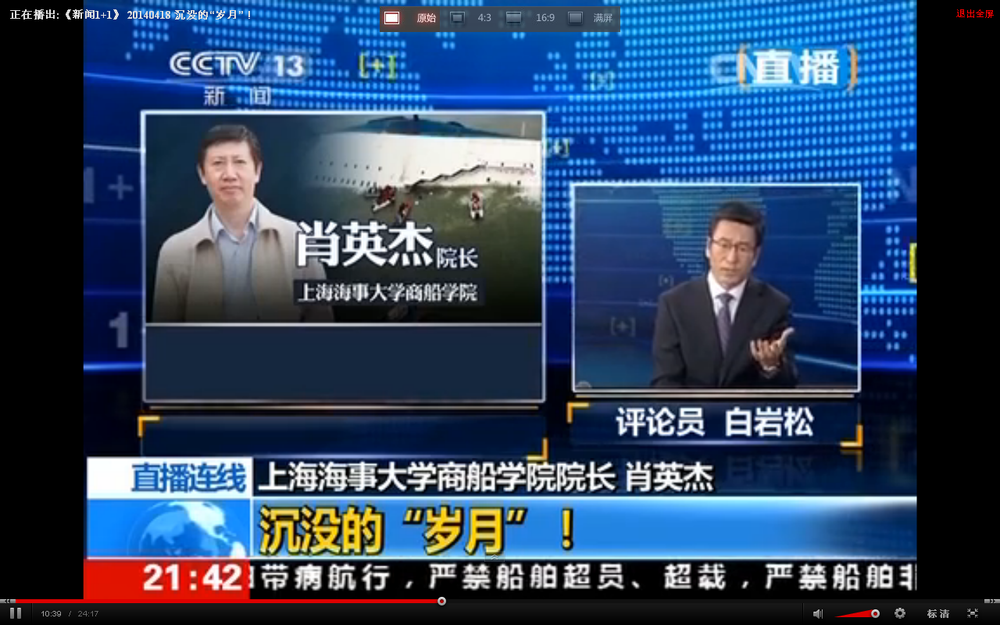 4月18日晚,中央电视台“新闻1+1”栏目播出了韩国客船“岁月”轮沉没事故专题节目《沉没的“岁月”》。节目中,主持人白岩松3次连线采访了我校商船学院院长肖英杰教授,双方就韩国客轮倾覆事故有关救援时间、应急措施、事故责任以及善后处理等问题进行了探讨。