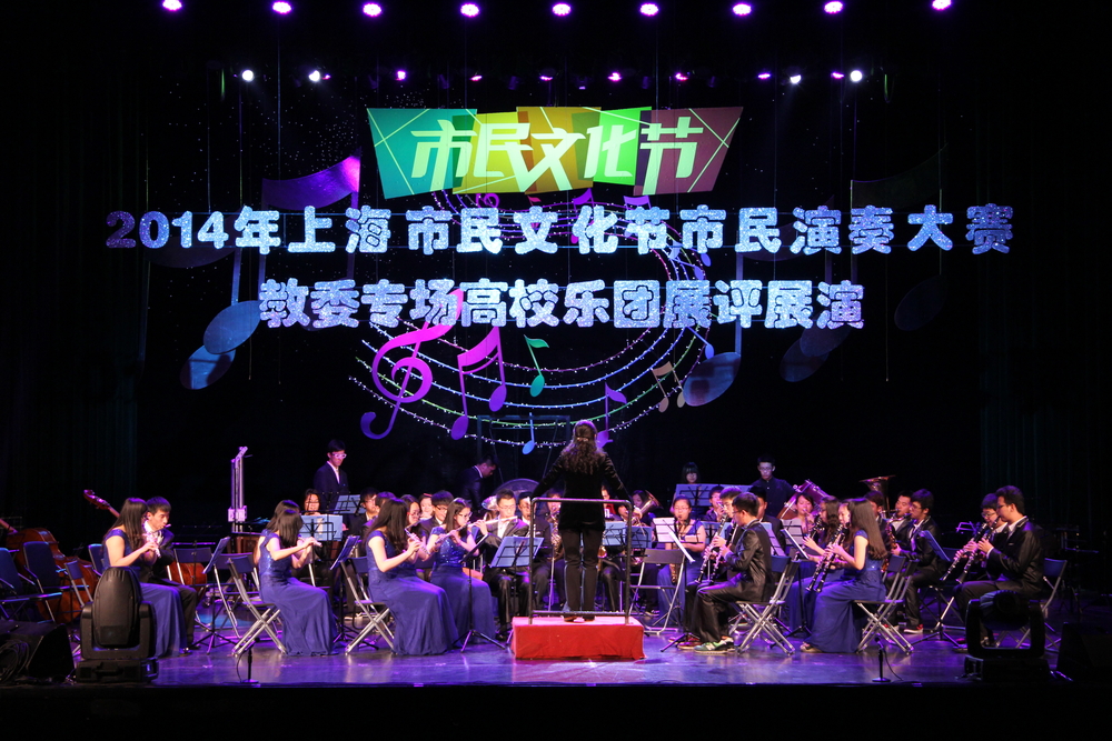 5月31日下午,上海市民文化节市民演奏大赛展演在上海群众艺术馆举行,复旦大学、上海交通大学、上海音乐学院、同济大学等八所高校的乐团作为代表参加了此次演出。上海海事大学作为其中唯一交响管乐团队参加了展演。