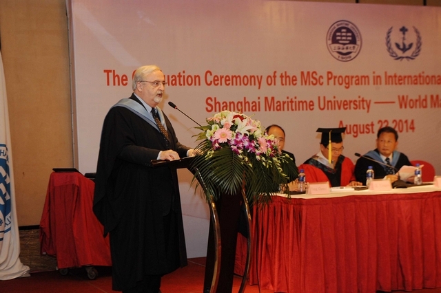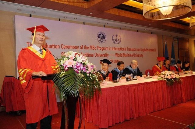 近日,上海海事大学与世界海事大学合作举办的“国际运输与物流”硕士项目第九届学员毕业典礼顺利举行。世界海事大学代理校长尼尔·百利腾、马硕副校长,我校黄有方校长、金永兴副校长及交通运输学院、国际教育学院、国际交流处、研究生院等学院和部门负责人,教师代表等出席毕业典礼。