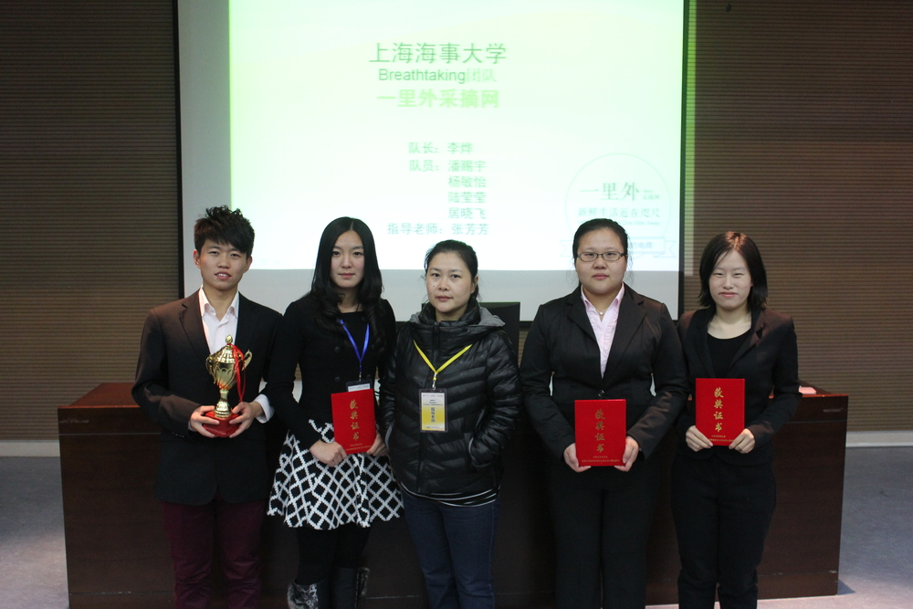 12月1日,邮储银行杯中国互联网协会第七届(2014)全国大学生网络商务创新应用大赛总决赛在北京落幕,上海海事大学师生在大赛中取得佳绩。由经济管理学院张芳芳老师指导的潘赐宇、陆莹莹、杨敏怡、李烨、居晓飞团队和张瀚文、王玮珊、王程程团队分别获得全国总决赛特等奖和二等奖,张芳芳老师被评为优秀指导教师。