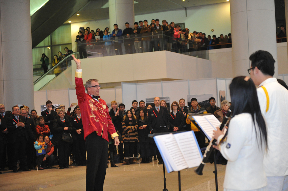 1月4日,由上海海事大学徐悲鸿艺术学院、图书馆、团委共同主办的“恭贺新年中外音乐展”在图书馆大厅精彩上演。来自荷兰皇家NS交响乐团70多位音乐家亮相图书馆,与校管乐团的同学们进行了一场音乐上的交流,为海大师生带来了一场音乐上的视听盛宴。