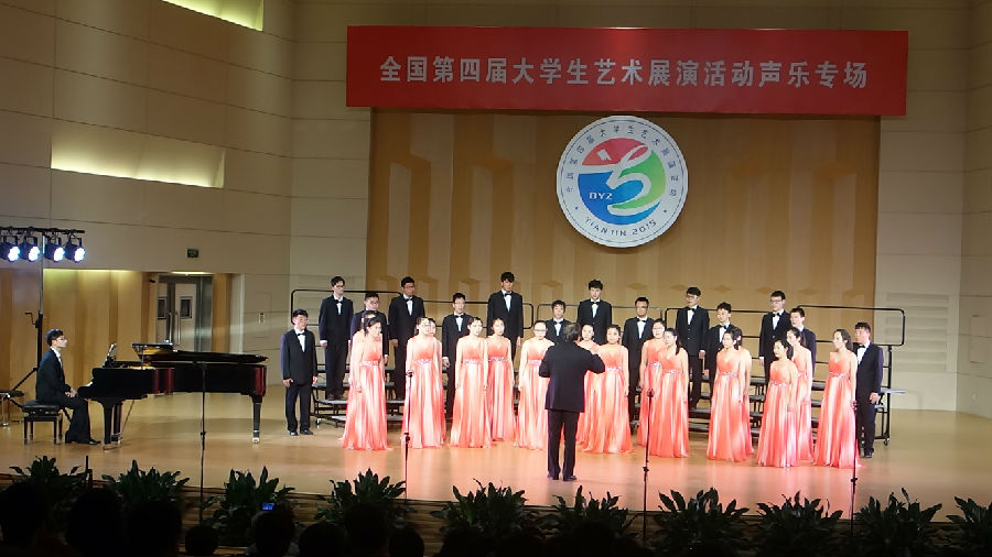 近日,全国第四届大学生艺术展演总决赛在天津落幕,我校学生合唱团作为入选全国总决赛的团队,于 2月26日在南开大学音乐厅参加了比赛。我校合唱团在张极新教授带领下第22个出场,表演了《调笑令•胡马》等曲目,精湛的表演获得了台下阵阵掌声,并最终荣获全国一等奖。本次展演全国共有44所高校入围全国总决赛,其中上海高校5所。