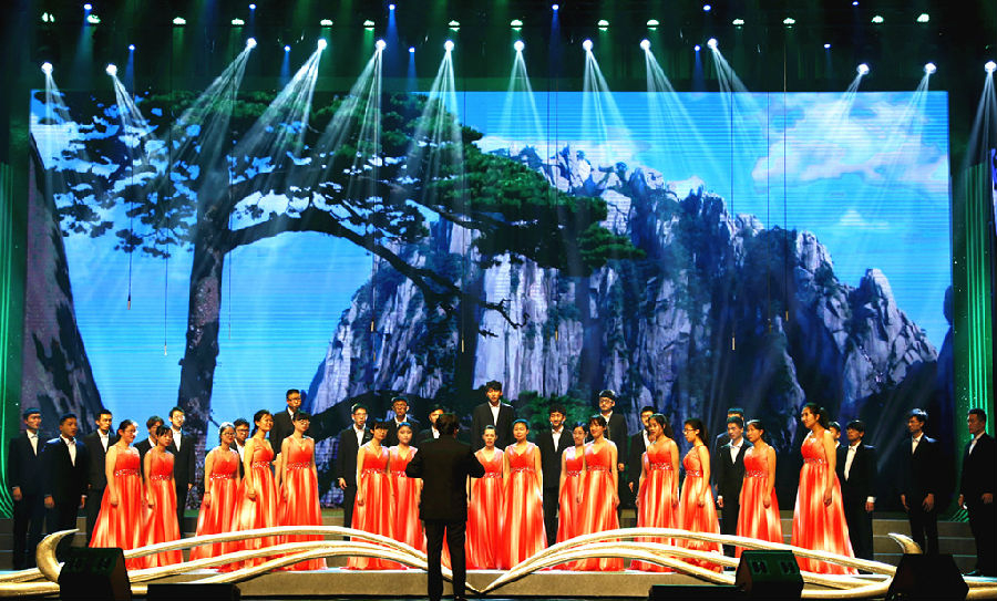 我校合唱团与复旦大学、交通大学等几所获奖高校同台演出,表演了《调笑令•胡马》等曲目。