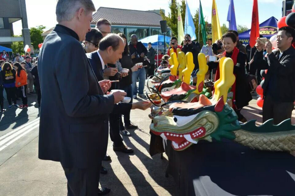 4月25日,华盛顿州第十届挑战杯龙舟赛在华盛顿州首府奥林匹亚市盛大开幕,比赛吸引许多宾客包括当地华人华侨现场观战,共享龙舟之盛举。中国驻旧金山总领事罗林泉、龙舟节委员会荣誉主席Joseph Williams等贵宾为本届龙舟赛的四只龙首“点睛”,随后圣马丁大教堂牧师Peter Tynan为龙舟赛举行祈祷仪式,奥林匹亚区华人协会的舞龙表演,为龙舟赛增添了浓墨重彩的中国元素。龙舟赛正式开始之前,罗林泉总领事一行还专程与上海海事大学、上海中医药大学的师生进行亲切交谈、合影留念,并送上祝福。
