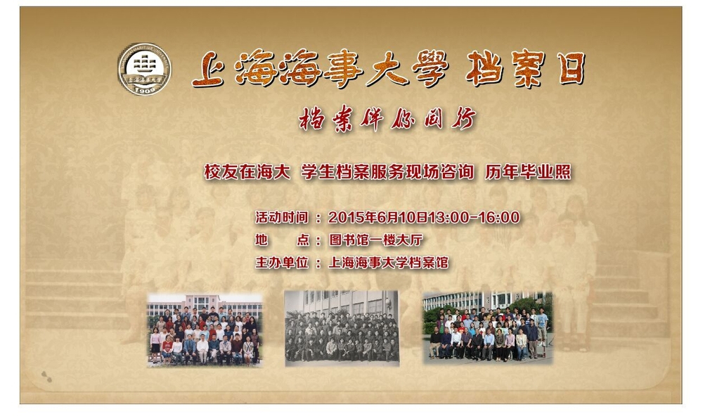 为了迎接6月9日国际档案日的到来,上海海事大学档案馆分别以“致青春——大学记忆”“岁月留痕——校友在海大”为主题,立足馆藏资料,挑选了档案馆珍藏的各学院不同时期的毕业照,以及不同领域的校友在海事大学求学期间留下的点滴足迹,制作了“档案与传承”主题展。本次主题展于2015年5月27日在上海海事大学图书馆大厅举行,展期将持续两周。
