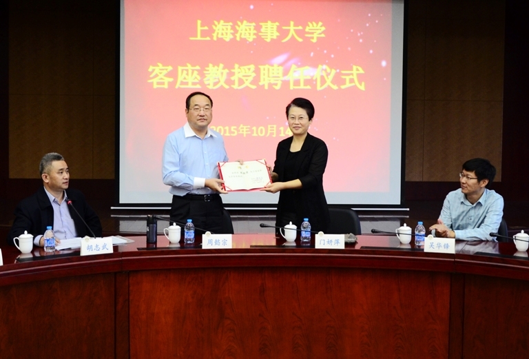 10月14日下午,上海海事大学75级校友、上海海事局副巡视员周懿宗(教授级高工)受聘我校客座教授仪式在行政楼128会议室举行。校党委副书记、纪委书记门妍萍为周懿宗校友颁发客座教授证书,并佩戴校徽。信息工程学院、人事处、商船学院相关负责人和师生代表参加了受聘仪式。