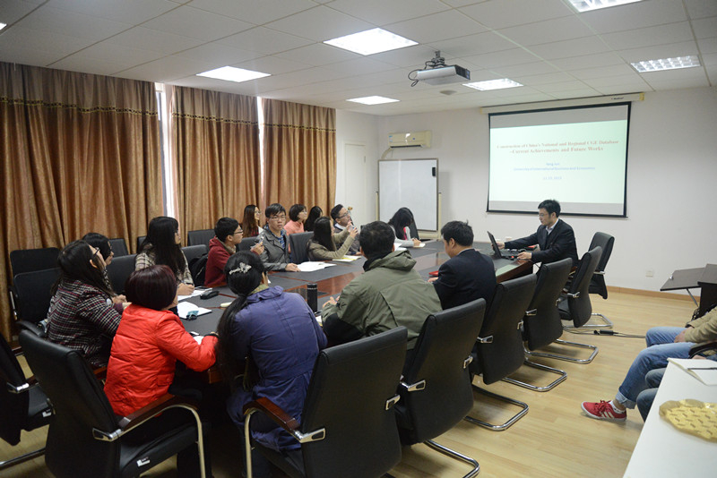 仪式结束后,杨军教授以“Construction of China’s National and Regional CGE Database”为主题,为在场师生作了精彩报告。他对国家和区域两个层次的可计算一般均衡模型(Computable General Equilibrium,CGE)数据库的构建进行了详细介绍,并对其未来在我国政策分析中的作用进行了细致分析。杨军教授与在场师生们交流了数据库构建中潜在问题的解决方法,解答了在场师生对该模型在建模及计算过程中的疑惑,令现场师生受益匪浅。