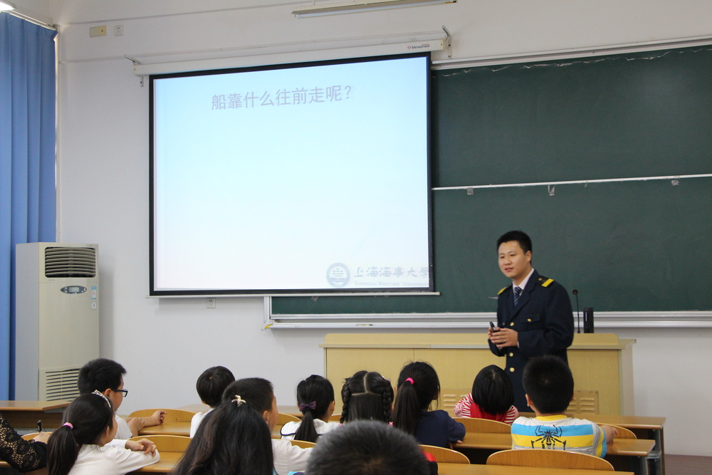 商船学院夏海波老师《跟着船长去探险》的精彩讲座也吸引了不少孩子,制作精美的PPT课件向孩子们揭开了地球形态及构成、地球怎样变成一张平面的地图、航海历史、伟大的航海家等精彩科普知识。在航海横拟实验室,孩子们还体验了“小小船长”的职责,有模有样地开着 “大船”到世界各地的港口“航行”了一圈。