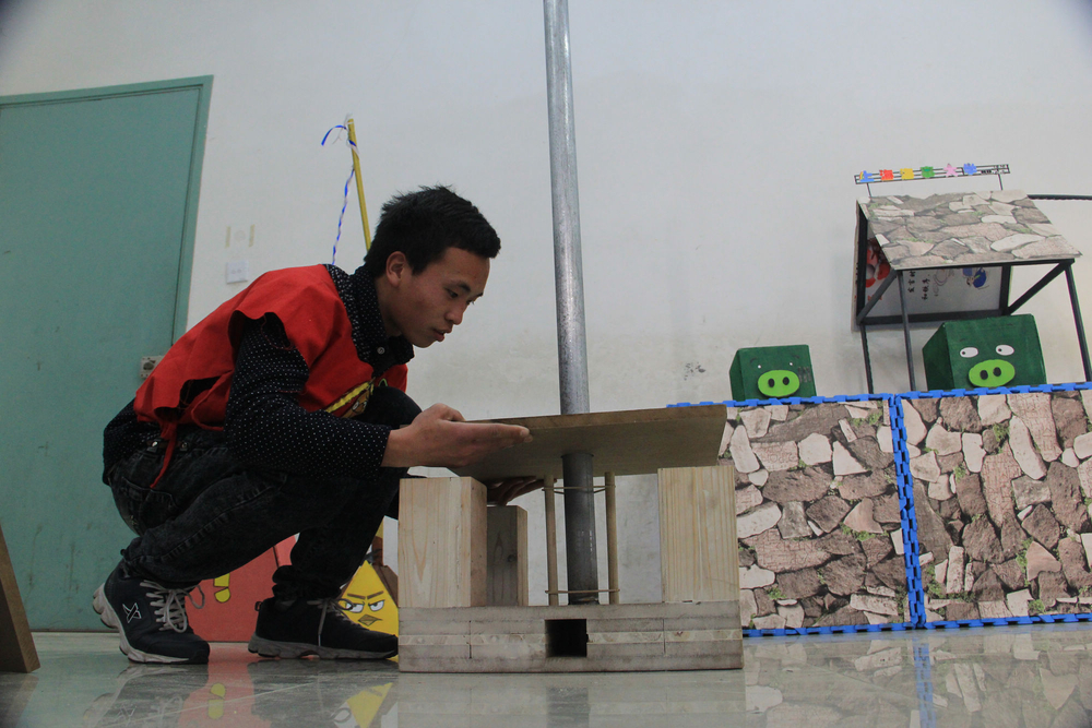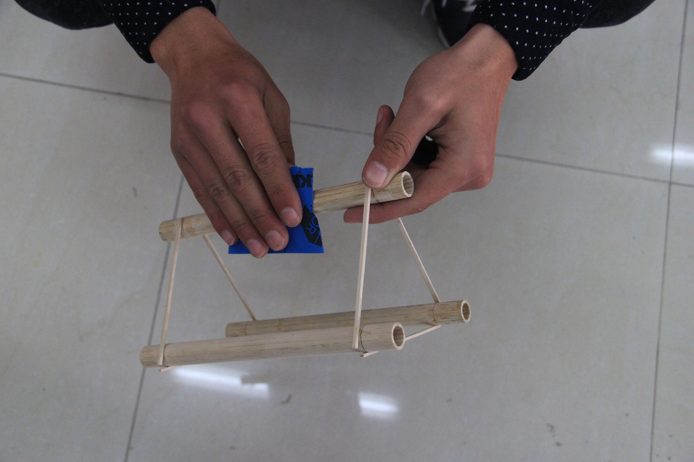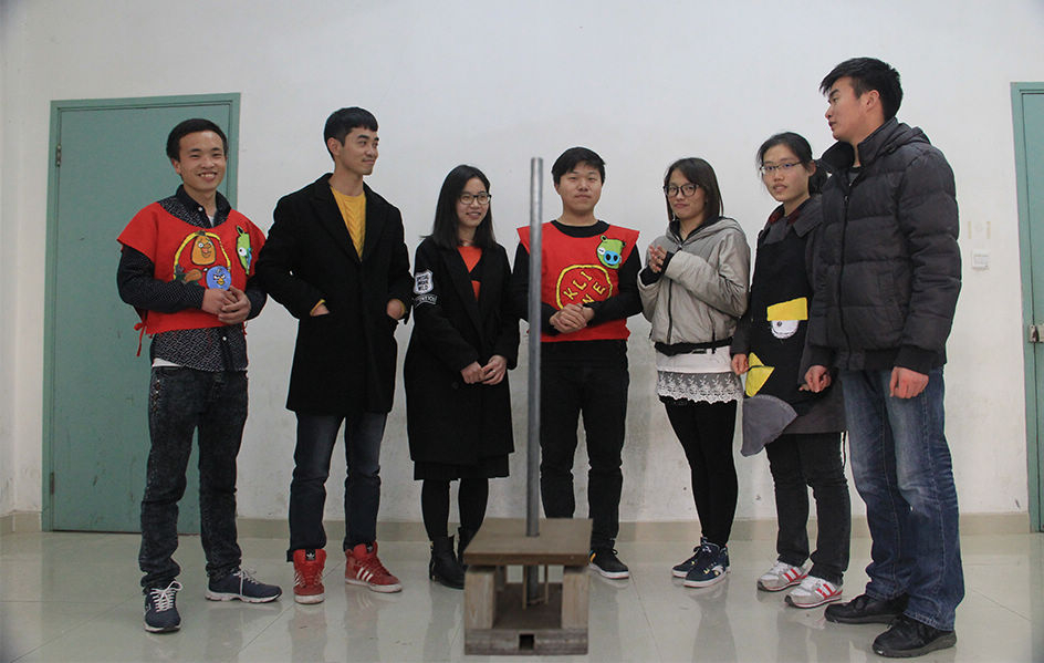 此次我校《承压两次的结构》赛题队员为由来自2013级的殷飞、沙煜、唐雁、马骁燚和2015级的王维智、张心怡等同学组成。他们克服寒假、春运等众多困难,为决赛提前做好各项准备工作。队员们集思广益运用学到的知识设计并制作结构与道具,这不仅仅考验着他们的实践能力,同时也培养了创新精神与团队精神。从构想到成型,无数方案被提出而后又被否决,但他们带着成品最终还是在比赛中交出了一份满意的答卷。