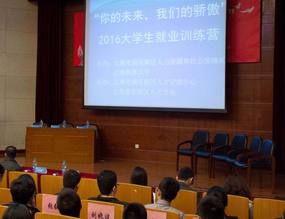 3月30日上午,由上海海事大学和浦东新区人力资源和社会保障局共同主办的“你的未来,我们的骄傲”2016年浦东新区大学生就业训练营在我校中远报告厅举行。浦东新区人力资源和社会保障局副局长蔡敏、人才市场总经理王万鹏,海航物流集团有限公司综合管理部总经理王正,我校党委副书记、副校长王海威及学生处负责人等出席活动。