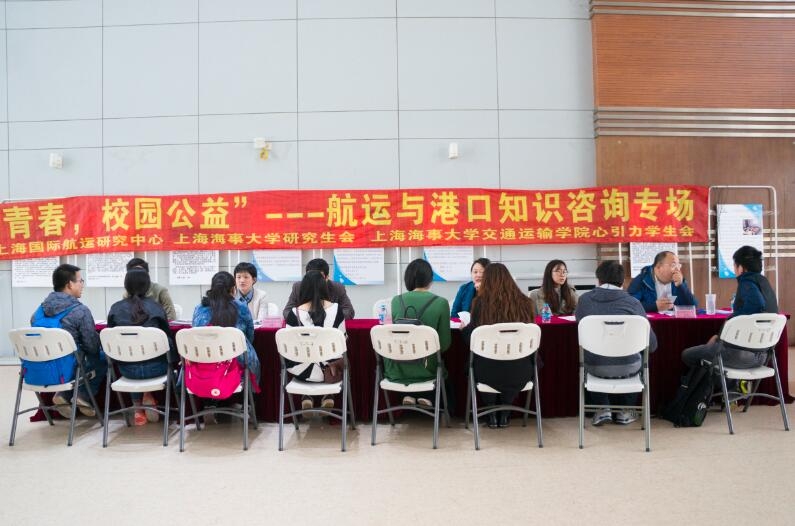 4月27日下午,“筑梦青春,校园公益”航运与港口知识咨询专场在上海海事大学举行。咨询活动现场吸引了很多学生参与。