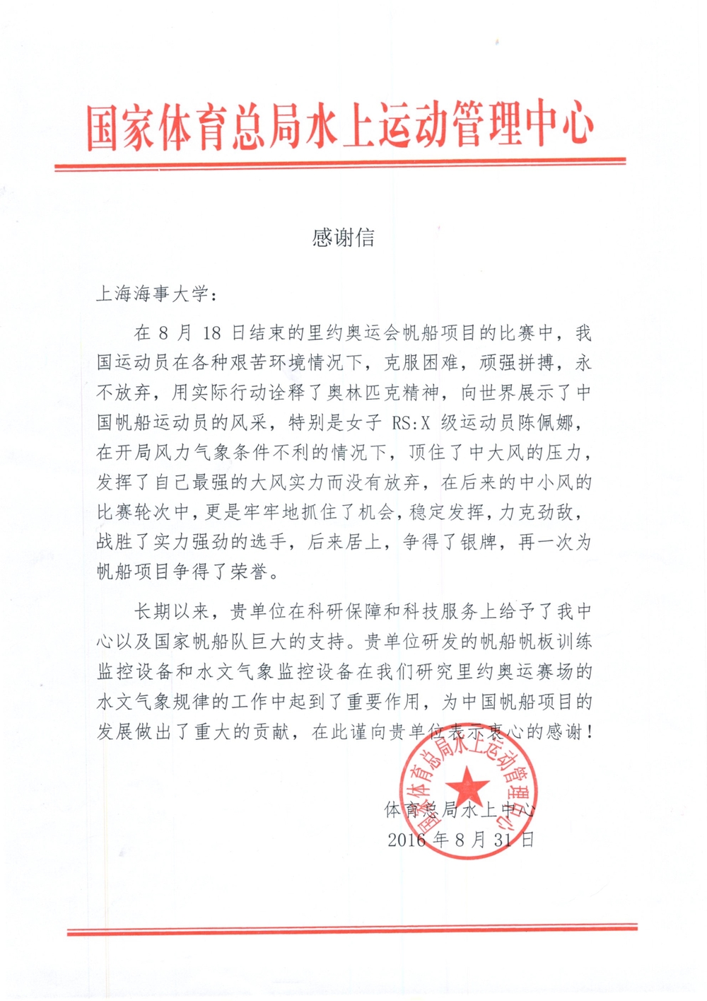 近日,国家体育总局向上海海事大学发来感谢信,对我校科研团队为中国奥运水上运动项目发展做出的重要贡献表示感谢。