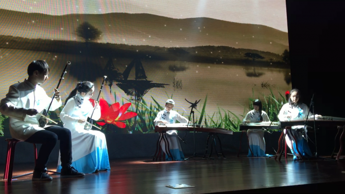在闭幕式上,上海海事大学民乐团为大家带来了二胡和古筝合奏的《渔舟唱晚》。此曲取自唐代诗人王勃《滕王阁序》中“渔舟唱晚,响穷彭蠡之滨”的诗句。民乐团团员们用娴熟的技艺与忘我的演奏,为大家描绘出了一幅夕阳映照万顷碧波的画面,不仅奏出了渔民们悠然自得的喜悦心情,更将叶叶扁舟随波逐流、满载而归的画面用声音生动地传递出来,为观众带来了精神上和听觉上的双重享受。上海海洋大学以舞蹈《海魂》赢得了观众们的阵阵掌声;上海建桥学院的诗朗诵《西去列车的窗口》,以饱满的精神和铿锵的斗志,点燃了听者们内心的激情。