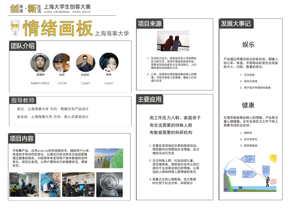 历时近一个月的2016年上海高校学科竞赛活动之“创未来·新生活——首届上海大学生创客大赛”于日前在同济大学设计创意学院落幕。我校徐悲鸿艺术学院张立副教授、物流工程学院张会焱老师指导的物流工程学院施盛东、张辰,徐悲鸿艺术学院宋金阳、杨琪团队的创意项目“情绪画板”获得上海市三等奖。