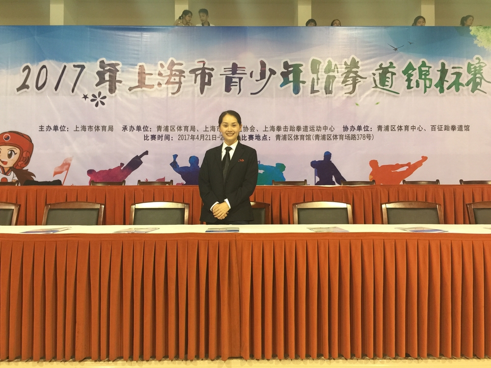 4月22日,2017年上海市青少年跆拳道锦标赛在青浦区体育馆举行。我校文理学院体育部丁响老师应邀参加本次大赛,并担任总裁判长。