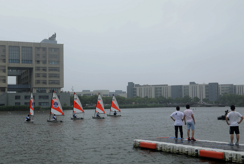 智慧湖帆船基地依山傍水,从学校海燕山脚下绵绵延伸至智慧湖中。自建成试运行以来,智慧湖帆船基地吸引了校内外一批批帆船爱好者前去体验和观摩。智慧湖帆船码头为校内帆船爱好者提供了零距离接触帆船、体验帆船的机会,也为校帆船协会学生提供了训练平台。目前,学校帆船协会每天组织学生开展2小时帆船训练,主要包括帆船理论课堂、帆船实物讲解、帆船运动史学习、以及帆船水上实操等。