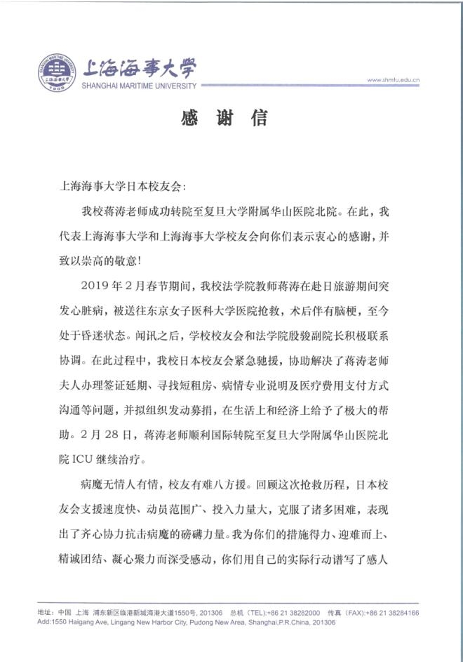 为了表达感谢,黄有方校长专门致信日本校友会,感谢他们关心学校,关爱教师,在蒋涛老师危难之时雪中送炭,帮助他和家属渡过难关,这份大爱相连的情怀使学校师生深受感动,并祝愿日本校友会的校友们幸福安康。