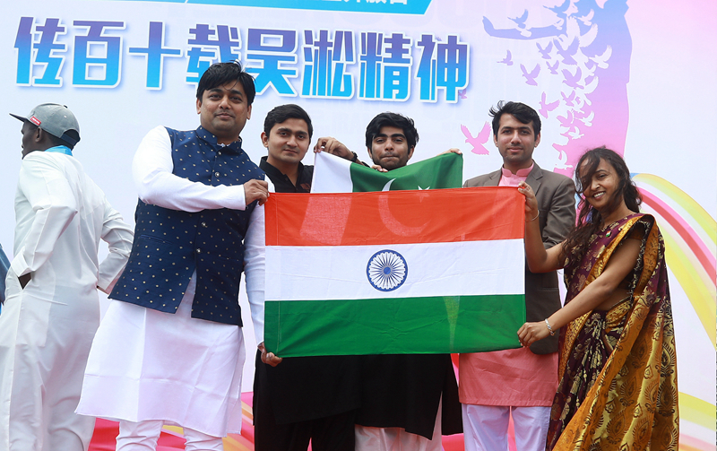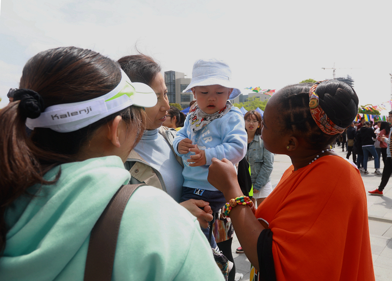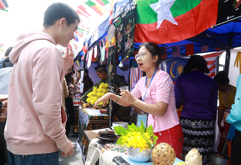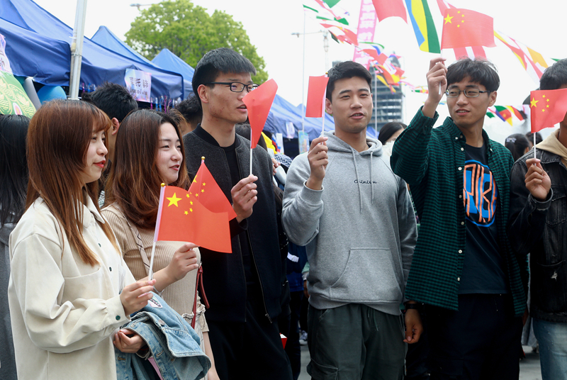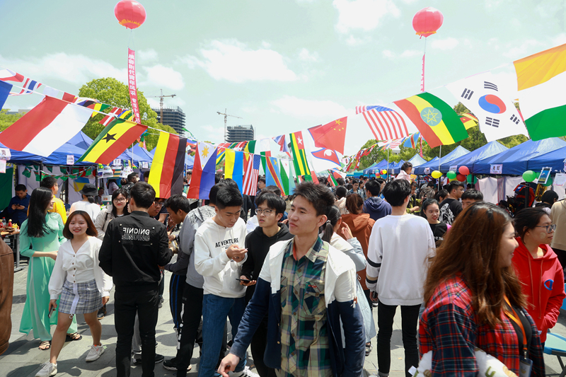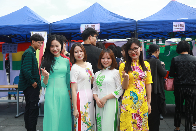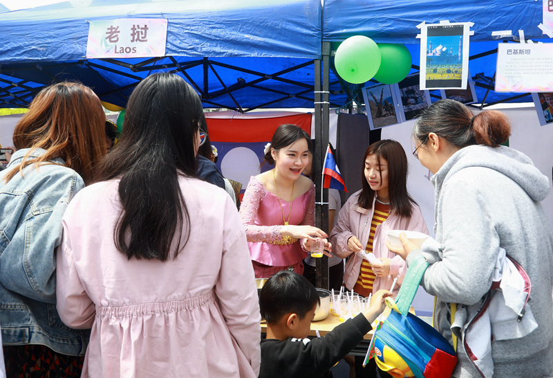 借助一年一度的校园国际文化交流节,来自40多个国家的数百名在校留学生,也纷纷在图书馆前广场搭建起展台,展示各自国家的民俗风情、民族文化和学校的国际化办学水平。