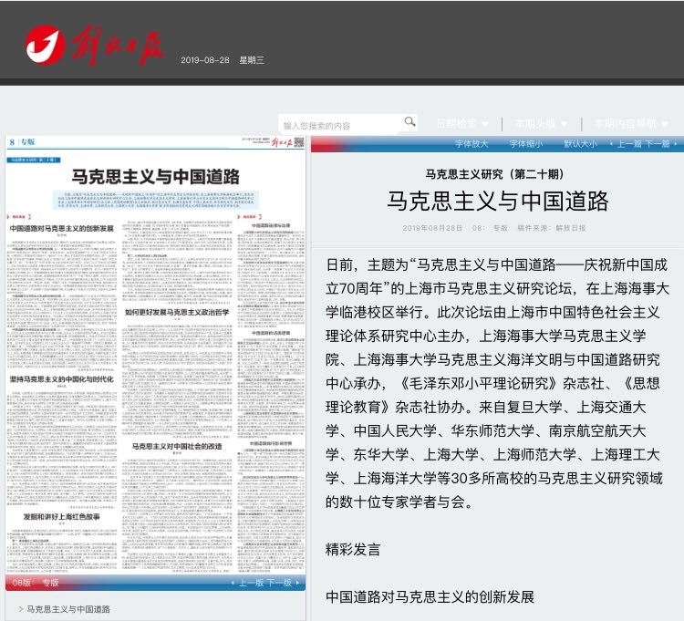 8 月28日,《解放日报》专版报道了上海海事大学举办的2019年上海市马克思主义研究论坛“马克思主义与中国道路”研讨成果。该版从精彩发言、观点集粹等角度报道了本次论坛与会专家发言的主要观点。