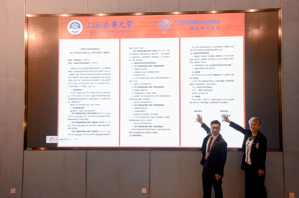 签约仪式上,门妍萍副书记和、王浩副总经理共同为“海大-环世航运货代物流行业人才培养专项基金”签署协议。