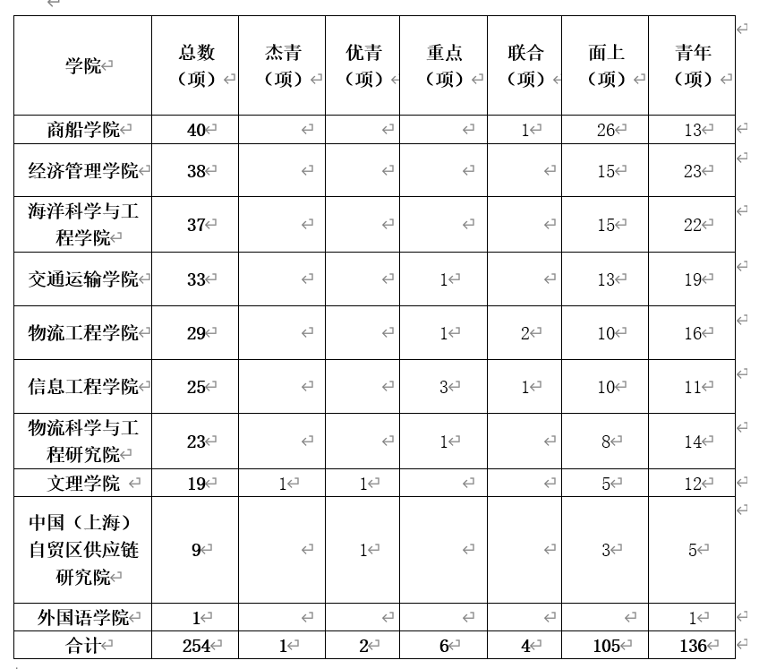 日前,上海海事大学圆满完成2020年度国家自然科学基金项目集中申报工作,全校10个部门共申请254项国家自然科学基金项目。其中包括1项国家杰出青年科学基金项目,2项优秀青年科学基金项目,6项重点项目,3项联合基金项目,105项面上项目,136项青年科学基金项目。高层次项目申报数比上年增长50%。