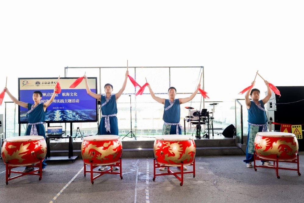 主题分享结束后,商船学院学生为市民带来一场别开生面的沉浸式航海文化体验。同学们以郑和下西洋的历史故事为背景,通过鼓舞演绎出海上丝绸之路开辟过程中的坚毅与气魄。“未来航海家”社会实践团队成员,将航海知识科普与旗语表演相结合,带领观众沉浸式学习传统航海文化,感受航海者赖以生存的规则、协作与智慧。