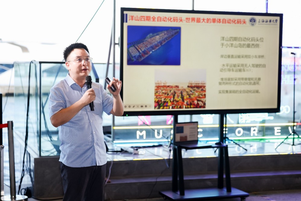 学校航海技术专业05级校友,中国极地研究中心高级船长肖志民,以《牧海耕洋,诗与远方》为题讲述航海事业故事。让大家直观的了解到,文明的飞跃与航海事业紧密相连,航海文化是不断传承的中国智慧,更是对全人类“命运共同体”的守护 ,航海精神是在辽阔海洋上与自然共生,在重重困难下突破自我,危急时“我留下,你们先走”的担当。学校交通运输学院副教授朱玉华以《向海图强,书写蓝色辉煌》为题,聚焦航运产业的发展前沿,通过数据讲解近年来我国航运业的发展成就,详细介绍作为世界最大单体自动化码头的洋山四期全自动化码头和上海领先全球航运中心城市的综合实力,让在场观众对航运事业有了更系统、更深刻的认识。