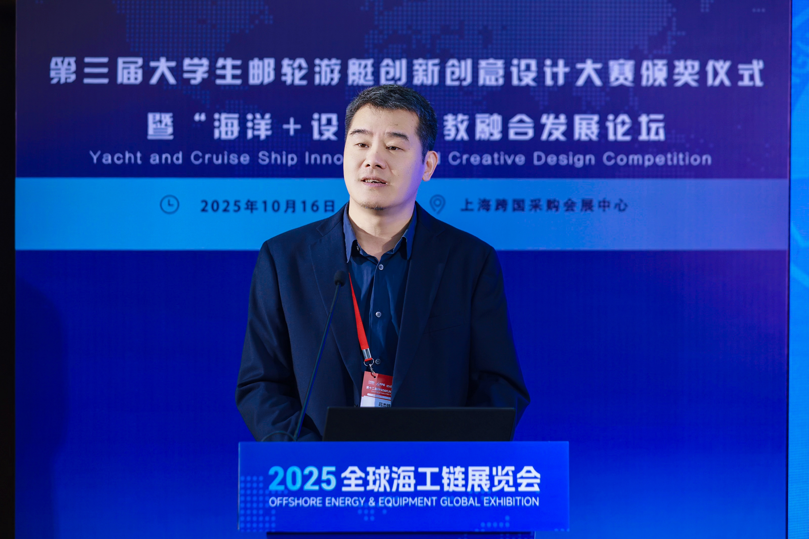 10月16日,2025大学生邮轮游艇创新创意设计大赛颁奖仪式暨“海洋+设计”产教融合发展论坛在上海跨国采购会展中心举行,活动作为2025全球海工链展览会(简称OEEG海工展)的分会场精彩亮相。校党委书记宋宝儒出席并致辞,200多名校内外师生参加了此次活动。