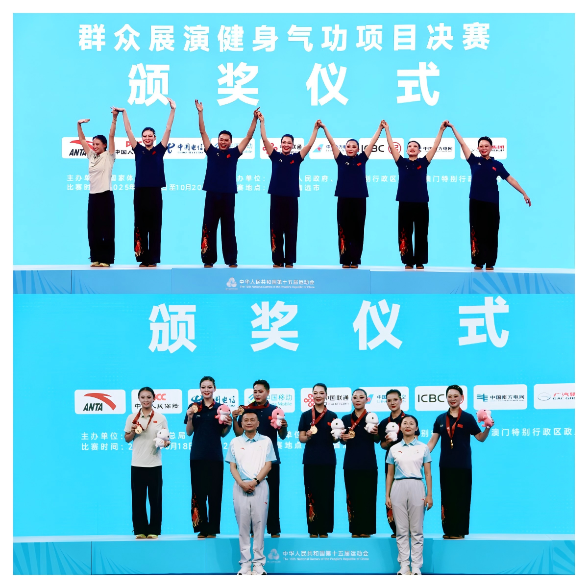 第十五届全运会健身气功决赛于10月18日在广州清远举行。在集体五禽戏项目中,上海代表队凭借近乎完美的动作和富有感染力的表现摘得桂冠。值得骄傲的是,6位成员中有3位来自上海海事大学,学校徐海凤老师担任上海队教练,庄旭芳、陈炜东老师作为核心成员。这是继2021年上届全运会后,上海海事大学教师再次代表上海在该项目中成功卫冕,实现两连冠。值得一提的是,这两届比赛中,该金牌均为上海健身气功队斩获的唯一金牌。