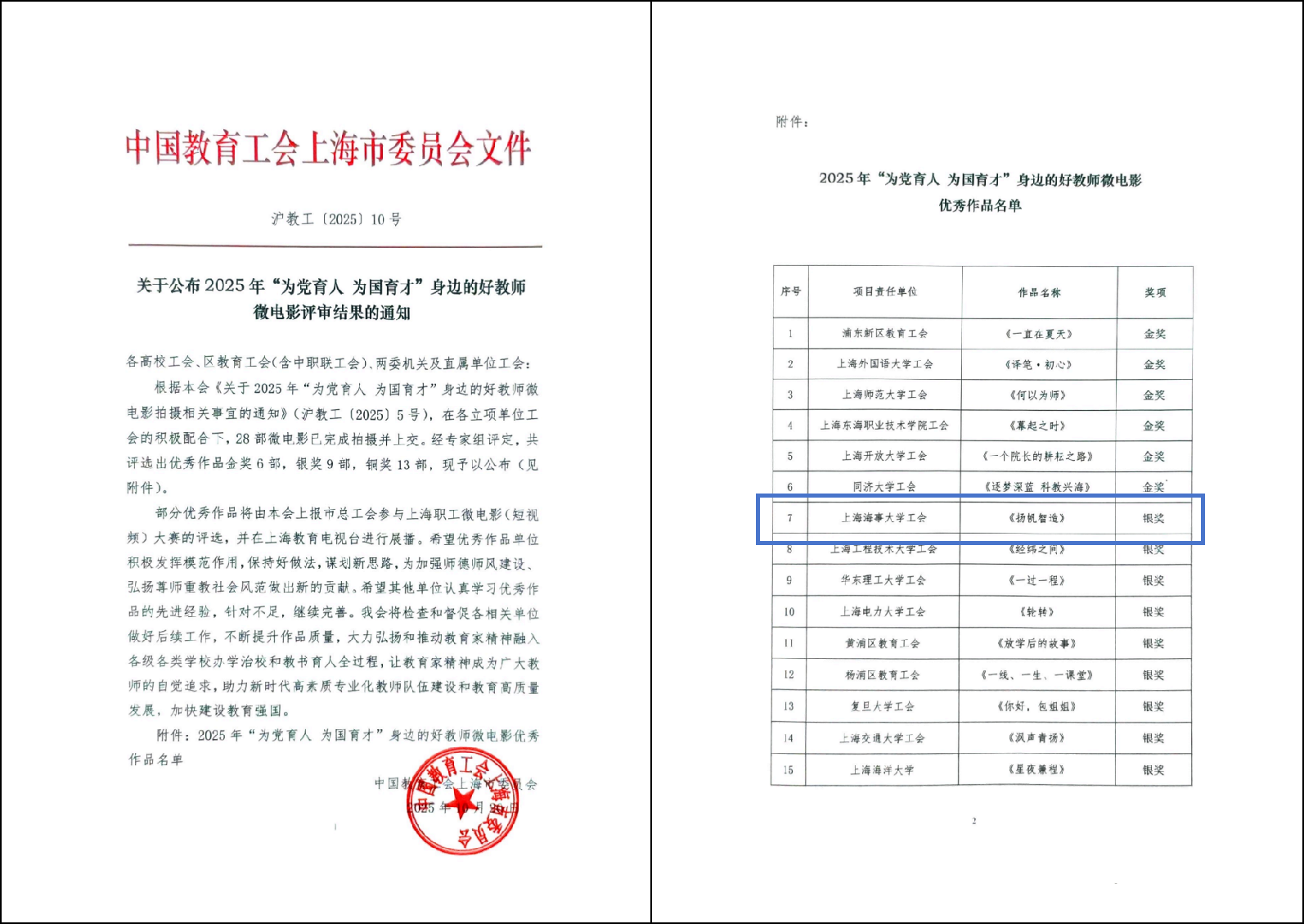近日,上海市教育工会印发《关于公布2025年“为党育人、为国育才”身边的好教师微电影评审结果的通知》(沪教工〔2025〕10号)。由校工会组织申报并摄制的微电影《扬帆智造》在评选中荣获银奖。