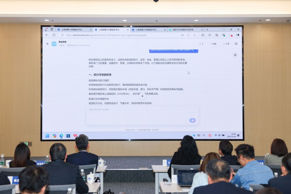 发展规划与质量管理处负责人详细介绍了云端海事大学的建设构想、整体架构及五年规划(2025-2030年),并对“海商法大模型”进行了现场演示。通过将师生实时提问输入“海法快答”与“海法深问”模块,直观展示了该模型在不同海法教育场景下的差异化功能。