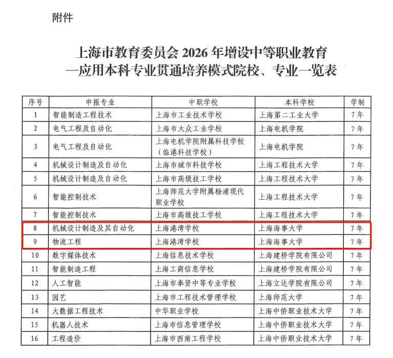 近日,上海市教委正式公布2026年中等职业教育—应用本科专业贯通培养新增专业名单,学校物流工程学院和上海港湾学校联合申报的机械设计制造及其自动化、物流工程两个专业成功获批,这是学校贯彻落实《教育强国建设规划纲要(2024—2035 年)》《教育部财政部关于实施中国特色高水平高职学校和专业建设计划(2025-2029年)的通知》等文件精神,响应国家职业教育改革要求、对接上海城市发展战略、破解产业人才瓶颈、推进“十四五”规划落地的重大举措。
