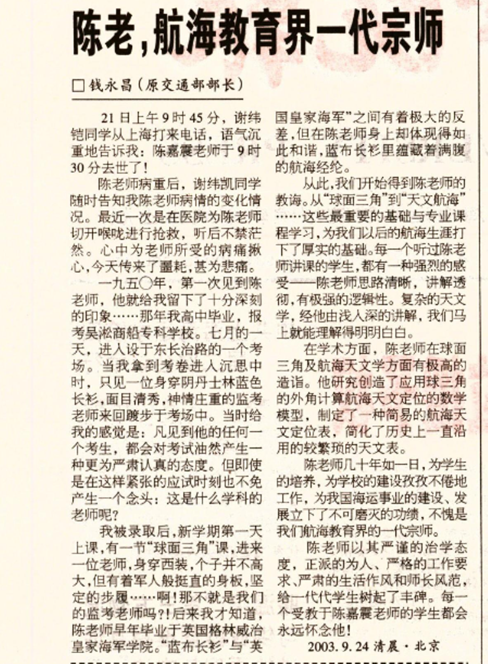 原交通部部长钱永昌撰文追忆恩师陈嘉震(2003年9月28日)