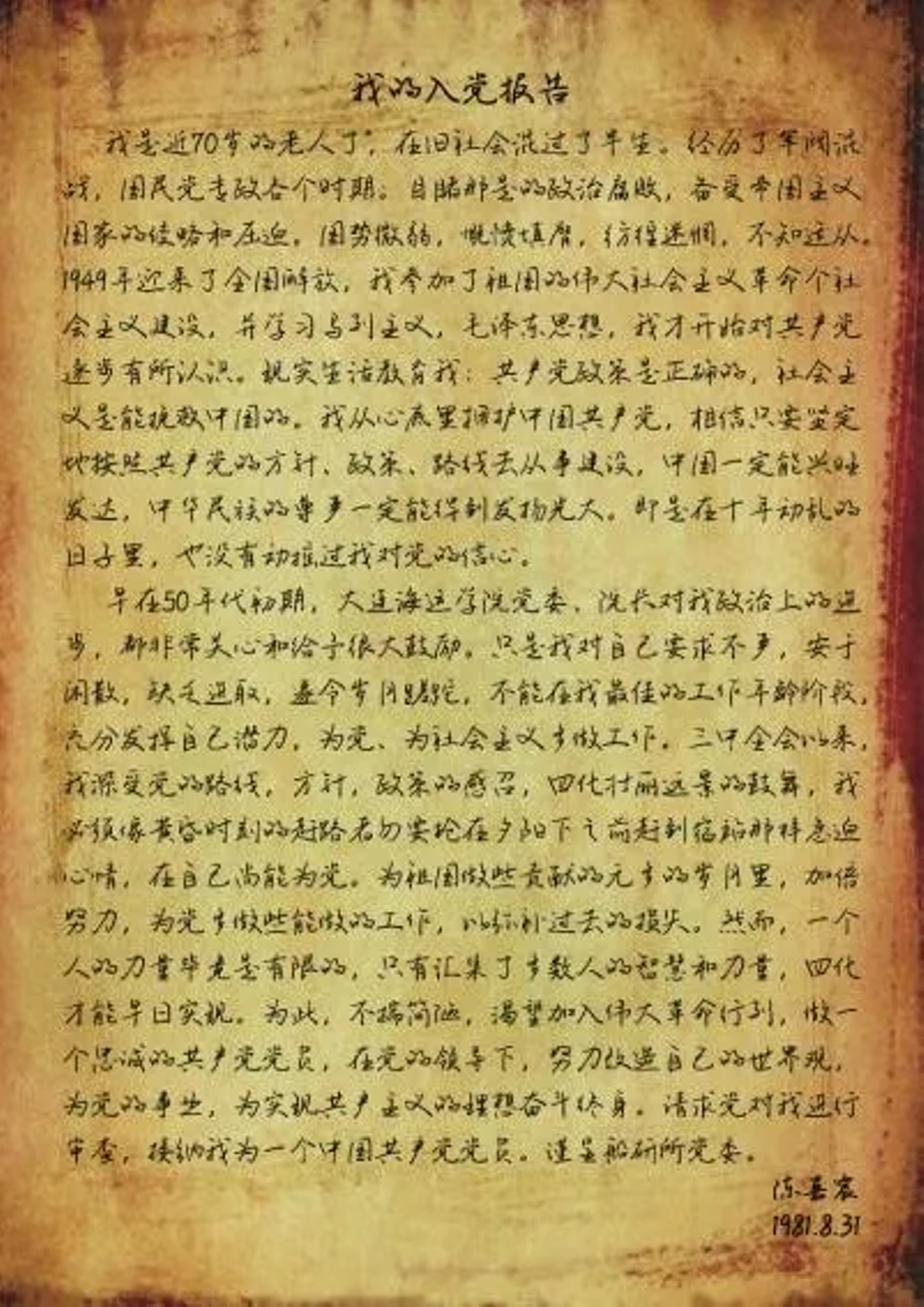 陈嘉震近古稀之年提交的“入党报告”(1981年8月31日)