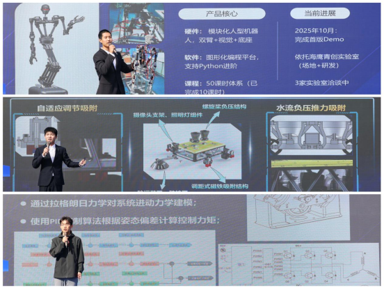 在大学生优秀科创作品展示环节,“海盾智清”团队聚焦船舶污染防治痛点,展示了其自主研发的船舶智能除污系统,凭借自适应复合吸附等核心技术,实现了高效、环保的作业效果。“智能车”团队展示自主研发的车辆,彰显了大学生科技创新的蓬勃力量。“超维方程”团队带来的“行者G1”人型机器人,融合AI与具身智能,为STEAM教育提供了创新解法,并已实现成果转化。这些项目生动体现了海大学子立足专业、回应需求的创新活力。